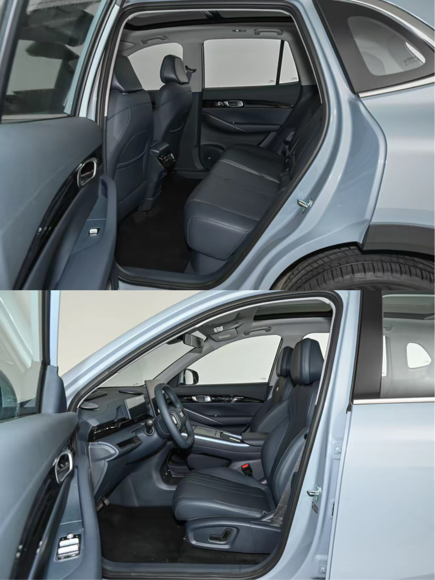 再看银河E5,得益于更长的车身尺寸优势,它的空间表现同样亮眼。我以相同的坐姿体验后排,腿部空间余量同样接近20公分,整体乘坐感受和零跑B10不相上下。毕竟银河E5的车长比B10多出100毫米,在空间的基础潜力上更占优,但两款车实际的车内驾乘空间体验,勉强算是可以打个平手吧。