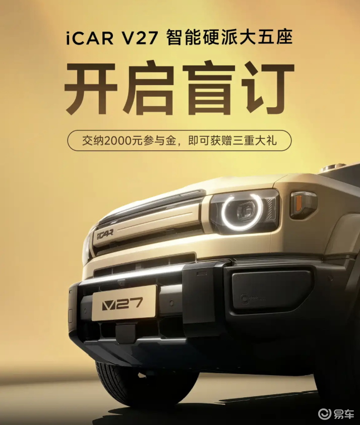 盲订期间,消费者交纳2000元参与金,即可获赠三重大礼,包括:1、购买V27车型所产生的购置税费用,由iCAR承担;2、抢先到店试驾车辆,即可获赠精美礼品;3、车辆交付,即可获赠官方专属定制惊喜礼品,价值3000元。