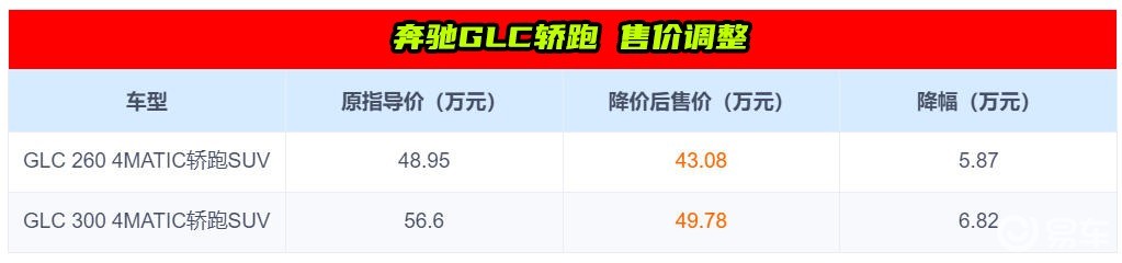 奔驰GLC 轿跑在售2款车型官降5.87-6.82万元,降价后新车最低配车型售价来到43.08万元,也是此次奔驰官降4款车型里从起步价就开始优惠近6万的车型。