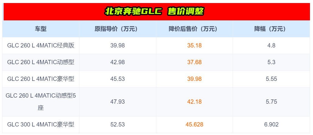 奔驰GLC在售5款车型官降4.8-6.902万元,降价后新车最低配车型售价来到35.18万元起步,相较原先近40万的起售价也降低了将近5万元。
