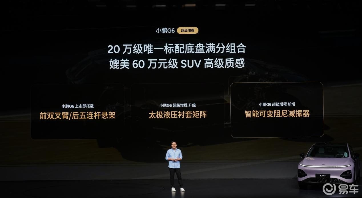 底盘系统是小鹏G6超级增程的又一亮点。新车全系标配太极AI底盘,同级唯一标配前双叉臂、后五连杆独立悬架,搭配太极液压衬套矩阵与智能可变阻尼减振器,以20万级唯一标配底盘组合,实现了媲美60万级SUV的高级质感。新车还拥有5项AI底盘能力,具备感知广、执行快、可迭代的优势,可实现最远提前200m识别、最大提前300ms调节,并具备超强自学习能力,最快21天可迭代一个新功能,能够轻松应对城市、乡村、高速等多种路况。