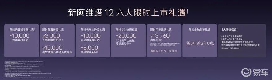新阿维塔12定位未来智能豪华轿车,面向时代精英人群,主打豪华、智能、旗舰级出行体验。新车全系标配12项顶格配置,涵盖华为乾崑智驾全系统、太行智控2.0、35.4英寸4K全景星环屏、25扬英国之宝音响、全车9安全气囊等,百万豪车顶配选装功能悉数标配。同时推出六大限时购车礼遇,购置税补贴礼遇、配置升级礼遇、老车主升级礼遇、ADS高阶包抵扣权益、贷5年首2年0息金融礼遇、万元用车无忧礼遇,入门即满配,彻底打破豪华门槛。