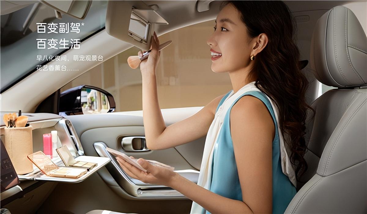 我有一个发现,像B01副驾这边的设计很有意思,有六个磁吸的接口。副驾带拓展功能,挂钩、折叠桌板这些小细节,有急事要赶个文件,这里就是我的办公桌。