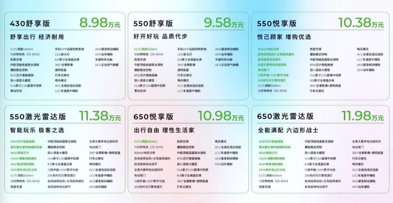 保持观望的有福了,因为10万级轿车的格局大变天了。特别是刚上市的零跑B01,10万级的车还给配了激光雷达+高通8295芯片,价格压到了8.98万-11.98万元 。