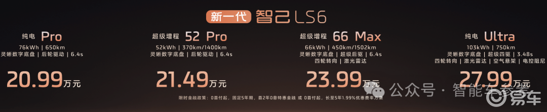 最后看下价格和配置,本次预售发布会焕新的重点是增程版,此外也有纯电动力,其中Pro版不同动力就差了5000块钱,Max配备了激光雷达,拉长了续航,增程版Max和纯电版Pro的电池度数只差了10度,Ultra版则是四驱动力,这个价格在正式上市后或许还有惊喜。
