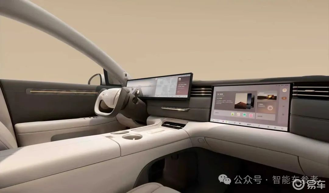 中控屏来不再是横贯挡风玻璃的带鱼屏,而是分割成了两块3K屏。一块是仪表盘和中控屏相连,一块是15.6英寸的副驾屏,比一般的办公本还大。